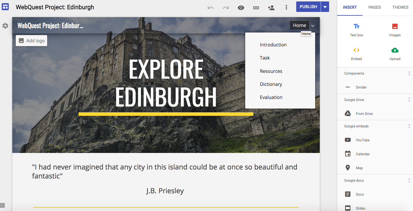 Figure 1 illustrates a sample WebQuest learning module using the features on Google Sites to build the site: https://sites.google.com/view/webquest-project-edinburgh/home